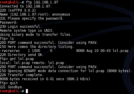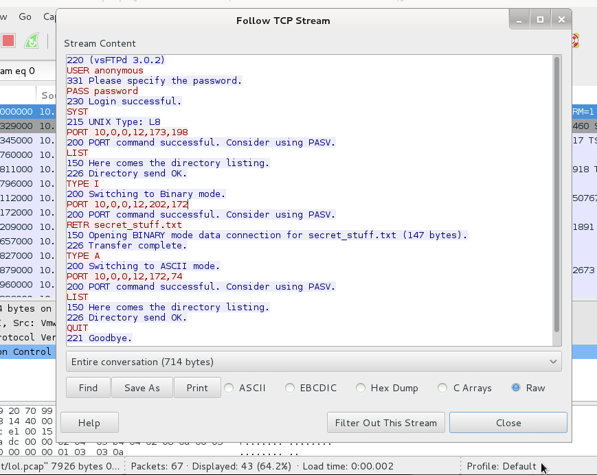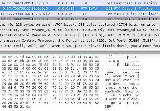 What’s that I see… secret_stuff.txt ? Thanks muchly. I then spent an embarrassing amount of time bashing my head on the keyboard running the above and various other commands in my FTP window to try and find the secret stuff, all to no avail. Only to realise that the data I needed was right in front of me in Wireshark…. >_>