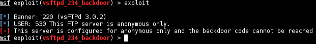 Not mad yet, mildly amused. There was nothing in the source of these pages and I didn’t want to DirBust it unless it’s a last resort, so I left it and went for VSFTPD. Before connecting directly I recalled a Metasploit module for this I saw a while back. I didn’t expect it to work but hey, it’s worth a try for all of the 10 seconds it would take.