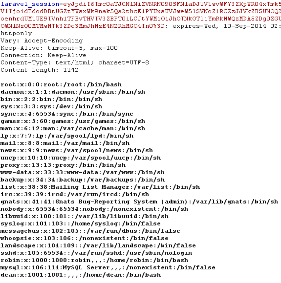 No, home run. I noted a couple of users that were quickly identifiable. It was at this point that I admit to being stuck for ages, as I tried poking around other locations to try and enumerate further information but didn’t get anywhere meaningful. Then I finally noticed the ‘laravel’ cookie and having no idea what laravel was, a subsequent Google search told me it was a PHP framework and further reading identified a database config file to be located at app/config/database.php. Back in Burp repeater I changed the location and removed ….// one set at a time until…